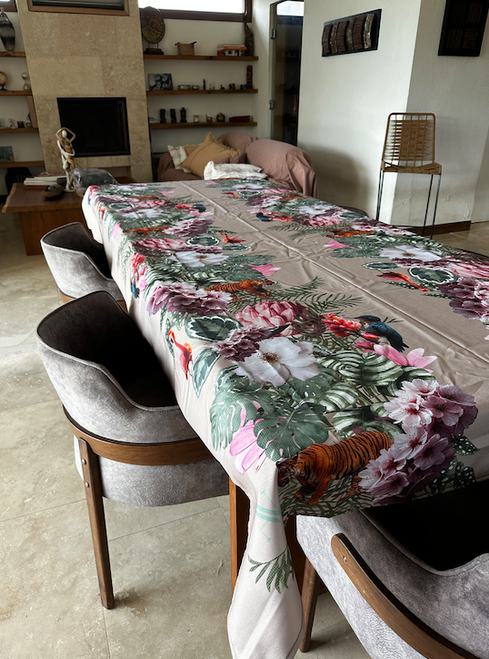 Entre flores tropicales y hojas vibrantes, tigres, flamencos y aves exóticas se entrelazan en una composición llena de vida.