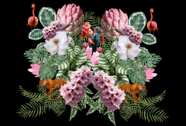 Entre flores tropicales y hojas vibrantes, tigres, flamencos y aves exóticas se entrelazan en una composición llena de vida.