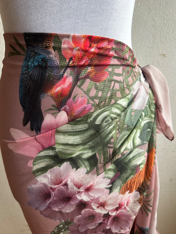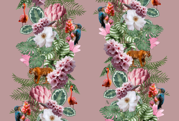 Entre flores tropicales y hojas vibrantes, tigres, flamencos y aves exóticas se entrelazan en una composición llena de vida.