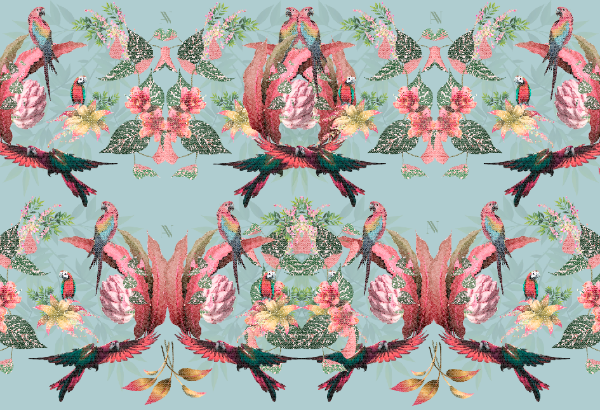 Entre flores tropicales y hojas vibrantes, tigres, flamencos y aves exóticas se entrelazan en una composición llena de vida.