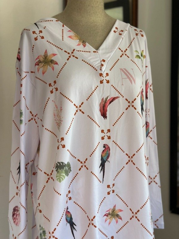 “Loros, hojas y flores tropicales que llenan tus sueños de color y frescura. Una estampa alegre y natural para descansar con espíritu libre.”