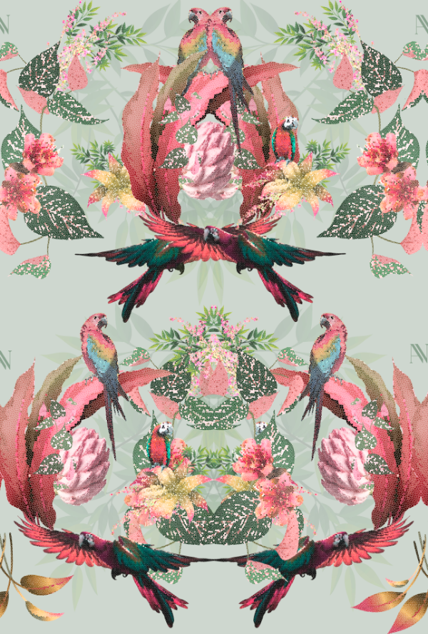 “Loros, hojas y flores tropicales que llenan tus sueños de color y frescura. Una estampa alegre y natural para descansar con espíritu libre.”